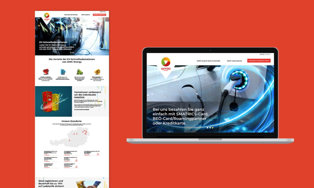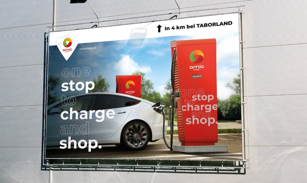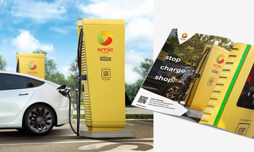 Für AMIC Energy entwickelten wir ein einheitliches Branding rund um die Elektromobilität des Unternehmens. Die Ladesäulen erhielten ein modernes, markenkonformes Design, das für klare Wiedererkennung sorgt.