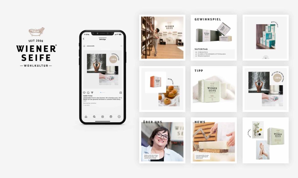Für Wiener Seife durften wir den Social-Media-Auftritt neu gestalten – mit dem Ziel, die hochwertigen Produkte in einem modernen, zeitlosen Look zu präsentieren. Dafür entwickelten wir ein maßgeschneidertes Corporate Design Manual für Instagram und Facebook, definierten Farben, Schriften und Gestaltungselemente neu und sorgten so für einen einheitlichen, stilvollen Markenauftritt.